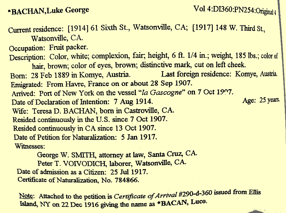 Watsonville, Santa Cruz County, California (~75 miles south of San Francisco, along the California coast) The first Croatians arrived in the Watsonville area in the 1880s but the most active time of immigration was from 1900-1914. Most came from Konavle (the southern-most tip of Croatia) and the island of Brac". There are today probably more Konavlian surnames in the Watsonville area than in any other place outside of Konavle. Below is a partial list of resources I found in a recent trip to Watsonville and Santa Cruz. This website is looking for this type of information for other communities where Croatians have congregated. If you have something we can use, please contact us. --------------------------------------------- Photo collections: Unknown (unidentified) photos from Watsonville. Please help us identify these people. Photos of Croatians taken in the US. Includes many photos from Watsonville. Photos of Croatians from Konavle. Includes many Watsonville families. --------------------------------------------- Pajaro Valley Historical Association Archive is at 332 E. Beach St., Watsonville, California 95076 Mail to: PO Box 623, Watsonville, California 95077 Website: www.pajarovalleyhistory.com Phone: 831/722-0305 Archive is open Tuesday, Wednesday and Thursday, 10am-3pm Jane Borg in charge Photo of front door of archive Resources (incomplete list): City Directories (1873, 1898, 1899, 1902, 1909-10, 1913, 1914, plus many newer ones), phone books (1896, 1897, 1911, 1928, plus many newer ones), surname files (newspaper articles, donated and gleaned info, etc), photo files, school yearbooks, school memory books, school registers (lists of pupils and teachers), scrapbooks, collection of Watsonville business cards, fruit box labels (many Croatians), transcriptions of oral interviews with Croatians. Note: If visiting the archive in person, it is a good idea to make an appointment ahead of time. There is not always someone there during the posted hours but someone always opens at 11am. Donations are always appreciated. -------------------------------------------------- Genealogical Society of Santa Cruz County PO Box 72 Santa Cruz, California 95063 http://www.cagenweb.com/santacruz/ The website above also links to other Santa Cruz County resources such as the County Recorder, a list of county cemeteries, some local history, etc. This group staffs the Local History & California Room located in the Santa Cruz Central Branch Library, 224 Church Street in Santa Cruz. Phone: 831/420-5794. Send research requests to Sara Bennett in care of the address above. $15 per hour. This genealogy group is much more "together" than most. Not only do they publish their own books, they also have their own bookbinder within their membership. Their newsletter comes out 6 times per year. Here's a partial list of the books they publish, which can be purchased: Births and Deaths 1856-1900 from Early Newspapers [Santa Cruz County] Births and Deaths 1901-1908 from The Daily Surf [Santa Cruz County] Births and Deaths 1909-1919 from The Daily Surf [Santa Cruz County] Santa Cruz Marriages 1856-1908 from Early Newspapers Santa Cruz Marriages 1809-1919 from Early Newspapers Santa Cruz County Probate Records 1851-1890 Santa Cruz County Naturalization Records 1909-1927 (example) Santa Cruz County Burial Permits 1905-1938 (2 vols.) The book below was recently published and can be read at the library. At this point it is not for sale. A Tombstone & Vital Records Survey to the Valley Catholic Cemetery, Vol. 1, Fletcher, 2001. ------------------------------------------------------------------------------- Miscellaneous: Croatian Mayors of Watsonville: Dr. Peter Marinovich (1951-1953); father was Filip Marinovic' of Pridvorje (Konavle). Louis Gluhan (1959-1960); father was Antone Gluhan of Uskoplje (Konavle). Ann Matiasevich Soldo (1983-1987); father was Nick Matijas"evic' of Popovic'i (Konavle) Betty Kesovia Bobeda (1995-1996) and (2001-2002); father was Vido Kesovija of Lovorno (Konavle). Street signs in Watsonville showing Croatian surnames: Alaga; Bencich; Franich; Gera; Vlaho "Charlie" Kralj; Anna Kralj, Nicholas Kralj; Scurich; Secondo A Watsonville map also shows the following street names. I could find the streets but no street signs to photograph: Pista Lane, Scurich Lane, Matiasevich Lane, Marinovich Avenue. Most are very short -- a few hundred feet at most. Business signs in Watsonville showing Croatian surnames: Braycovich, Buak, Bulich/Butier, Franich-1, Franich-2, Gizdich, Gulermovich, Kalich, Kasunich, Lettunich, Marinovich-1, Marinovich-2, Pista, Resetar-1, Resetar-2, Sambrailo, Scurich-1, Scurich-2, Scurich-3, Scurich-4, Soldo-1, Soldo-2, Stolich. Fruit box labels showing Croatian surnames: Alaga, Bachan, Bokarica-Matiasevich, Fiorovich, Lettunich, Resetar, Scurich Mural on Nick Alaga's patio in Watsonville: This mural shows the original Alaga home back in Konavle. The house was drawn from a photo but the rest of the mural is from the artist's imagination (and she had never been to Croatia). Nice mural, Nick. But it needs more rocks. Lots more rocks! The list below shows the above names in their original spellings. The home villages are in parentheses: Alaga; Alaga; (Bani in Konavle) Bachan; Bac"an; (Komaji in Konavle) Bencich; Benc"ic'; (S"krip, island of Brac") Bokarica; Bokarica; (Konavle region) Braycovich; Brajkovic'; (Gruda in Konavle) Buak; Bujak; (Mijkovi or Slano in Dubrovac"ka Primorje) Bulich; Bulic'; (?) Butier; Butijer; (Drvenik in Konavle) Fiorovich; Fjorovic'; (Vodovod'a in Konavle) Franich; Franic'; (C"ilipi in Konavle) Gera; Gera; (Gromac"a in Primorje, north of Dubrovnik) Gizdich; Giz"dic'; (Klis, near Split) Gulermovich; Guljelmovic'; (Obod or Cavtat) Kalich; Kalac"ic'; (C"ilipi in Konavle) Kasunich; (?) Kralj; Kralj; (Dunave in Konavle) Lettunich; Letunic'; (Mihanic'i in Konavle) Marinovich; Marinovic'; (Pridvorje in Konavle) Matiasevich; Matijas"evic'; (Popovic'i in Konavle) Pista; Pis"ta; (Lj