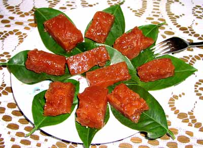 Kontonjata (pronounced KOHN TOHN' YAH TAH) is a jelled candy made of quince (dunja). It's made just like apple sauce except it's boiled longer. A natural jelling agent in the quince makes it set up firm. Approx. 5 lbs. of cooked quince. Approx. 4 lbs. of white sugar. (You can use a pound or two, more or less, of quince. But keep the proportion of sugar about the same: i.e., 80% of cooked quince by weight.) Wash off the fuzz and core the quince. No need to remove the skin. Cut into slices. Boil in water until mashable. Drain water. Weigh. Mash like potatoes. Add sugar (80% of cooked quince, by weight). Slowly simmer the mashed quince (don't add water) in large pot until bottom of pot can easily be seen while stirring with wooden spoon. Be patient -- constant stirring is necessary as water boils off. This can take up to 2 hours. Pour into a pan, spreading to 1 inch thick. It will jell as it cools. Once cool, slice into cubes. Often served on orange or lemon leaves with a toothpick inserted into each piece. Photo. Recipe from Jane Kralj Kukuljica of Ploc"ice, Croatia. Here is a photo of her village. |