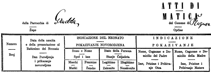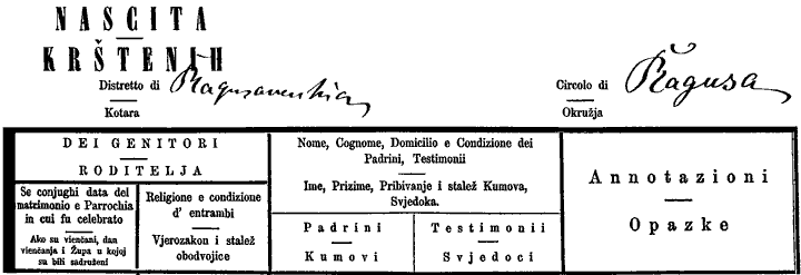 Across the top of each page of these books are pre-printed headings written in Italian, Croatian, or both. There were several styles for these books, variously used at different times and in different locations, but each contained the same basic information. Below are examples taken from Gruda R-6 (1872-1886) DAD. Gruda is a town in Konavle, a region southeast of Dubrovnik. R-6 means it's the 6th Rodjenih (birth) book. DAD are the initials for the Dubrovnik State Archives where the book resides.
