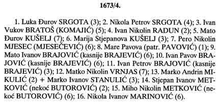 This text (below) is an excerpt from Stanovnis"tvo Konavala, Vol. 2, and partly describes the surname chart for the village of Mikulic'i. This is from the famous "earthquake census" taken in 1674. Names are the heads of households. The number in parentheses after each name is the total number of people within that household. The middle name is actually the father's name. For example, name #1 shows Luka Srgota whose father was D'uro. The original hand-written document also shows the age of the head of household as well as a few of the names of adults within each household. (nekoc' = formerly; kasnije = later; patr. = patronym)
