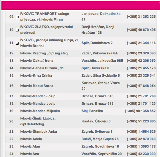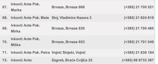 There is some information in the Croatian on-line phone book that can help you in addressing a letter or in finding the right person. Let's check over this list of Ante Ivkovic's, below.