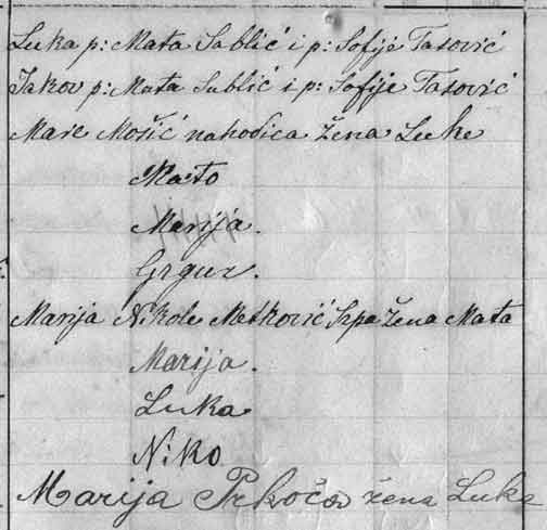 [The parents of Luka were Mato and Sofija. Both were deceased when this was written. Don't let the various declensional endings of Croatian names throw you. The parents' names were still Mato and Sofija even though they are spelled differently in this inflected language. (p: = pokojni = deceased)]