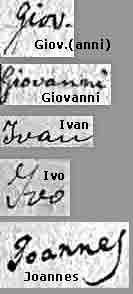 This information can be put to good use after you have found the original record book. For example, the first name of Boz"o (often Bob or Robert in the States; sometimes Ed or Edward or Ned) is Natale in many church records. If you did not know this, you could look right at your ancestor's church record and not know it. Charles or Charlie in the States is often Vlaho. Cvijeto is often shown as Florio in Croatian church records. John is Ivo or Giovanni.