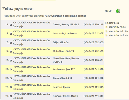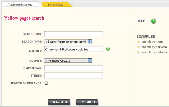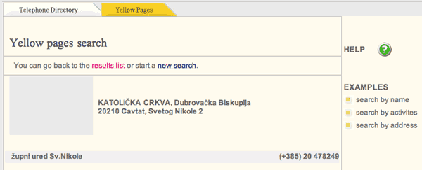 Here's how to find the phone numbers and addresses for church offices in Croatia using the Croatian on-line phone directory. The Croatian on-line phone directory (in English) is located at: http://www.tportal.hr/imenik/default.asp?lang=1 You will get a page that looks like this: ![]() Click on the "Yellow Pages" tab and you will get a screen that looks like this: ![]() Click on the green question mark button to the right of the ACTIVITY box and you will see a list of "activities." Scroll down to where it says: "Religious, social, humanitarian, and international organizations and institutions." Under that category you will see "Churches & Religious societies." Click on that and you will be presented with a window that looks like this, all filled out for you -- in English, yet: ![]() If you click on "Search" in this window (shown above), you will be presented with some 1300 churches in Croatia because you would be searching "The Entire Croatia." To narrow the search you can change "The Entire Croatia" to, say, the Dubrovnik area (20) and then click "Search," and you will get the image below. (Here is a map showing the various area codes in Croatia. An area code corresponds to a county.) If you just type in a village name (and leave "The Entire Croatia" alone) you will get the church for that village (if the village has a church). ![]() If there is a small + in a box to the right of the number (as most churches seem to have) then clicking on that box will result in the entire address including postal code. In this list, if you click on the plus next to #21 (the church in Cavtat) you will get this: ![]() This is the name, address, and phone number of the church. See below for how to extract the address from this information. Meanwhile if you click on the village, you will get a small map that tells you almost nothing. But to the left of the map you will see a slider scale which you can use to zoom in or out. You still must know some Croatian geography to find your way around these maps but they're better than nothing. Extracting addresses from the given information The image above says: KATOLIC"KA CRKVA, Dubrovac"ka Biskupija 20210 Cavtat, Svetog Nikole 2 Z"upni ured Sv. Nikole.............. +385 (20) 478249 This means: First line = Catholic Church, Dubrovnik Bishopric 20210 = postal code Cavtat is the village Svetog Nikole 2 is the street address Z"upni ured = Church parish The name of the church is "Sveti Nikola" = Saint Nicholas. The phone number is on the right. A letter to this church can be addressed like this: Katolic"ka crkva [or Z"upni ured] Svetog Nikole 2 HR-20210, Cavtat Croatia, Europe If the street address is not given, then the only address you need on the envelope is: Katolic"ka crkva [or Z"upni ured] [postal code] [city] Croatia, Europe Z" = Z with a small v over it; c" = c with a small v over it. (See here.) It's a good idea to put "Europe" on the envelope when mailing from the States because many of their postal workers don't know exactly where Croatia is. So then they toss your letter into the "Africa" bag and it takes 6 weeks to get to Croatia. It's happened to me more than once. It's a good idea to put HR in front of the postal code -- this is the internationally recognized code for Croatia. HR stands for Hrvatska which is the Croatian name for Croatia (Croatia is the Romanized name for Croatia.) For information on how to write to the churches, see here. Phoning these churches is not a good idea unless you can speak Croatian. If a city has more than one church, there is usually an address or name of church given in the on-line phone book to distinguish them. |
