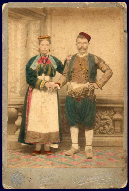 Nike Brajevic' of Mikulic'i and her future husband, Mato Rilovic' of Radovc"ic'i. Hand tinted. Photographer: S. Mascarich i Sin of Dubrovnik. Photo taken around 1910. These 2 villages are just a few miles apart in Konavle, a region southeast of Dubrovnik.