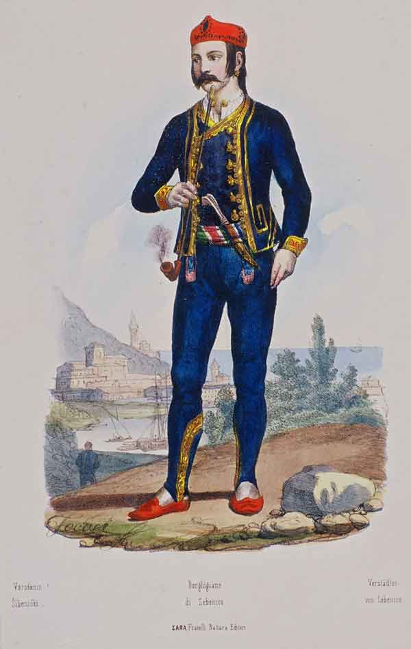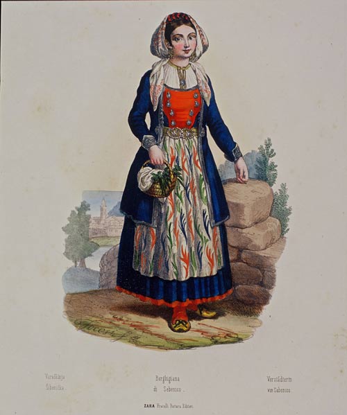 Here are some examples of national dress and embroidery from near S"ibenik, which is between Split and Zadar on the Adriatic coast. For a review and examples from a book on all the nosnje of Croatia, see here. Click on a small image below to view a larger image. |