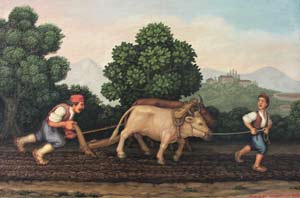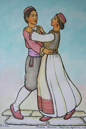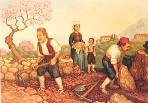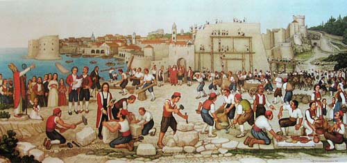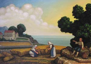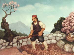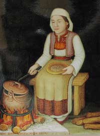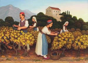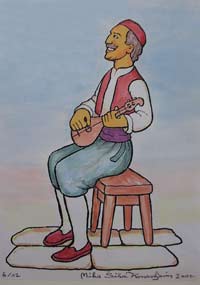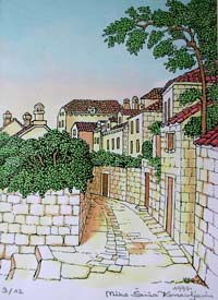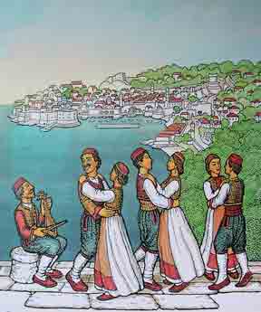 [NOTE: Mr. Šiša is now deceased, and the services mentioned below are only informational.] Miho S"is"a (pronounced SHE' SHAW) is a painter and sculptor in the naive or folk art style. His studio and gallery are in his ancestral home in the village of Mihanic'i, in the region of Konavle, not far from the Dubrovnik airport. He is the only folk artist in the Dubrovnik area and only the second along the Croatian Adriatic Coast. His scenes usually depict some form of Konavlian life -- the very life that our ancestors left when they emigrated. And through his careful research Mr. S"is"a has authentically shown the old styles of dress, customs, and tools as well as the landscapes of his native Konavle. This makes his work perfect for including in family history collections. I can think of no better way to show your posterity the styles and customs of their ancestors. And these prints are particularly attractive matted and framed on a living room wall. Also Mr. S"is"a is available for commissions. For example, he can paint your ancestral house or village. For commissions, contact him at the address below. Mr. S"is"a does not sell his originals except by special arrangement or commission. This webpage concerns only laser prints of the originals, which are made uniquely for each order. (Though some, such as Picture 1 and Picture 2, exist as lithographs.) Laser prints can be made any size as long as the 2 dimensions are proportional. In Europe the 2 common paper sizes are A4 and A3 (see below for exact sizes). A4 is somewhat like the U.S. "letter" size. A3 is twice that size. Because the images are of varying dimensions, unless you specify otherwise, your print will fill the paper (A4 or A3) to the largest extent that can be accommodated on that size paper. If you want a smaller size print, please specify the exact dimensions, but the prices are the same as for A4. For example, people often want smaller sizes of the flowers or fruits for their kitchen walls. High quality paper is used, specially designed for laser printing. A4 (paper size: 8.3" x 11.6") = $19 per print A3 (paper size: 11.6" x 16.6") = $29 per print Shipping = $12 per order (in mailing tube, airmail) Prices are in U.S. dollars. To convert to other currency, please consult a "currency conversion" website which can easily be found through a search engine such as www.google.com. To order, specify the Picture number (below), the size (A4 or A3), the quantity of each print, add in the shipping cost, and include a personal check or money order (in the currency of your country) made out to "Miho Sisa". He cannot accept credit cards. Mail to: Miho S"is"a Mihanic'i HR-20217 Pridvorje Croatia, Europe Mr. S"is"a is not connected to the Internet and has no e-mail address. [NOTE: Mr. Šiša is now deceased, and the services mentioned in this article are only informational.] ------------------------ The list, below, is only a few of the many prints available. Others can only be seen by visiting his gallery. Note: The images, below, were made with a hand-held digital camera and are of poor quality -- but good enough for the computer screen. The originals and prints are of much finer quality, showing better detail and color value. Picture 1. Wedding in Konavle. Shows different types of dress and customs. You can look at this painting often, learning more each time. Picture 2. Another wedding in Konavle. Fewer people and less detail than the one above. Picture 3. Depicts the building of Dubrovnik through various ages and stages. Lots of detail. Picture 4. St. Nikola Church in Cavtat. Picture 5. Dancers in national dress with Dubrovnik in background. Picture 6. Dancing couple in national dress. Picture 7 Picture 8 Picture 9 Picture 10. Four versions of native Konavlian flowers. Very nice on the kitchen wall. Picture 11 Picture 12. Two versions of native Konavlian fruit. Very nice on the kitchen wall. Picture 13 Picture 14. Two versions of a man in national dress playing the gusle. Picture 15. A hunter with his gun and dog, stoking a fire. Picture 16. A woman slicing prs"ut. Picture 17. A woman in national dress playing the tamborica. Picture 18. A man in national dress playing the tamborica. Picture 19. Village scene in Konavle showing rock buildings and walls. Picture 20. Man sampling his homemade wine. Picture 21. Woman washing clothes in a stone wash basin. Picture 22. Woman tending a cooking pot. Picture 23 Picture 24 Picture 25 Picture 26 Picture 27. Five working scenes showing the landscape, farming methods, tools, and dress of Konavle. |